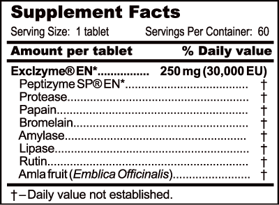 Exclzyme®EN – 250 mg (30,000 EU): Peptizyme SP®EN, protease, papain, bromeline, amylase, lipase, rutin, amla (Emblica Officinalis).