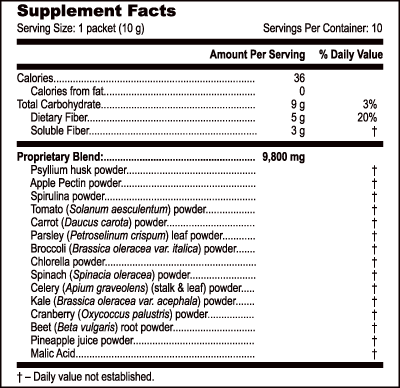 Proprietary Blend – 9,8000 mg: Psyllium (Plantago psyllium) husk powder, Apple Pectin powder, Spirulina (Spirulina platensis) powder, Tomato (Solanum aesculentum) powder, Carrot (Daucus carota) powder, Parsley (Petroselinum crispum) leaf powder, Broccoli (Brassica oleracea var. italica) powder, Chlorella powder, Spinach (Spinacia oleracea) powder, Celery (Apium graveolens) (stalk & leaf) powder, Kale (Brassica oleracea var. acephala) powder, Cranberry (Oxycoccus palustris) powder, Beet (Beta vulgaris) root powder, Pineapple juice (Ananas comosus) powder, Malic Acid.