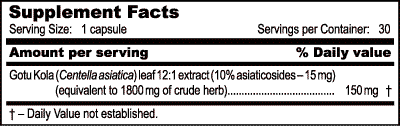 standardized Gotu kola (Centella asiatica) leaf 12:1 extract (10% asiaticosides – 15 mg) (equivalent to 1800 mg of crude herb) - 150 mg.