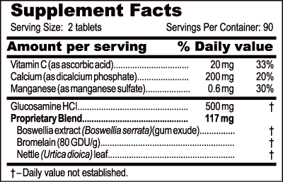 Proprietary Blend - 58.5 mg: Boswellia extract (Boswellia serrata)(gum exude), Bromelain (from Ananas comosus), Nettle (Urtica dioica) leaf.