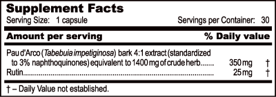 Pau d’Arco (Tabebuia impetiginosa) bark 4:1 extract (standardized to 3% naphthoquinones) (equivalent to 1400 mg of crude bark) - 350 mg, Rutin – 25 mg.