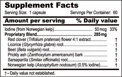 Proprietary Blend - 285 mg: Red clover (Trifolium pratense) flower 4:1 extract, Licorice root (Glycyrrhiza glabra), Beet root (Beta vulgaris), Sarsaparilla root (Smilax officinalis), Prickly ash (Zanthoxylum americanum) bark, Norwegian kelp (Ascophyllum nodosum) (0.5 % iodine).