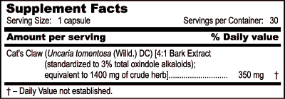 Cat’s Claw (Uncaria tomentosa (Willd.) DC) (4:1 bark extract standardized to 3% total oxindole alkaloids; equivalent to 1400 mg of crude herb) - 350 mg.